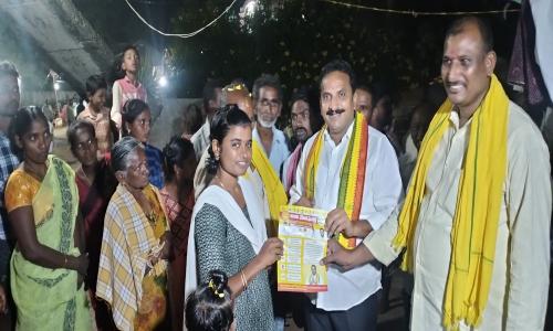 Amaravathi Jyothi - Andhra Pradesh / SPSNellore : మాయదారి జగన్ మనకొద్దు బాబును తెచ్చుకుందాం.. బాగుపడదాం లింగసముద్రం: అమరావతి జ్యోతి: రాష్ట్రాన్ని వెనక్కి తీసుకెళుతున్న జగన్మోహన్ రెడ్డి మనకు వద్దని, ముందు చూపుతో అభివృద్ధి చేయగల సత్తా ఉన్న చంద్రబాబు నాయుడుని మళ్లీ ముఖ్యమంత్రిగా తెచ్చుకుందామని కందుకూరు నియోజకవర్గ తెలుగుదేశం పార్టీ ఇన్చార్జ్ ఇంటూరి నాగేశ్వరరావు అన్నారు. బాబు షూరిటీ - భవిష్యత్తుకు గ్యారెంటీ కార్యక్రమాన్ని లింగసముద్రం పంచాయతీలోని జంపాలవారిపాలెం గ్రామంలో ఆదివారం సాయంత్రం నిర్వహించారు. ఇంటూరి నాగేశ్వరరావుతో పాటు, మండల పార్టీ అధ్యక్షుడు వేముల గోపాలరావు, ఇతర నాయకులు ఇంటింటికి వెళ్లి తెలుగుదేశం పార్టీ మినీ మేనిఫెస్టో వివరిస్తూ కరపత్రాలు పంచారు. ఈ సందర్భంగా నాగేశ్వరరావు మాట్లాడుతూ రాష్ట్రాన్ని ఉద్ధరిస్తాడని నమ్మి ప్రజలు జగన్మోహన్ రెడ్డికి ఒక్క ఛాన్స్ ఇస్తే, అభివృద్ధి చేయకపోగా రాష్ట్రాన్ని పాతికేళ్ళు వెనక్కి తీసుకువెళ్లాడని విమర్శించారు. అప్పు తీసుకురానిదే పూట గడవని దుస్థితిలో రాష్ట్ర ప్రభుత్వం ఉందని, వీలుంటే ప్రజలను కూడా తాకట్టు పెట్టగల దుర్మార్గుడు జగన్మోహన్ రెడ్డి అని అన్నారు. ఓడిపోతామని ముందే తెలిసిపోయి, టిక్కెట్ల పేరుతో కలెక్షన్లు మొదలుపెట్టాడని అన్నారు. ఎంత డబ్బు వెదజల్లినా, ఎన్ని మోసపు మాటలు చెప్పినా ప్రజలు నమ్మే పరిస్థితి లేదన్నారు. కందుకూరు నియోజకవర్గంను నెల్లూరు జిల్లాలో కలిపి అక్కడ జగన్మోహన్ రెడ్డి, ఇక్కడ ఎమ్మెల్యే మహిధర్ రెడ్డి ఈ ప్రాంత ప్రజానీకానికి తీరని ద్రోహం చేశారని నాగేశ్వరరావు విమర్శించారు. రాళ్లపాడు రిజర్వాయర్ కు దక్కాల్సిన సోమశిల నీటిని కూడా తీసుకురాలేక పోయారని అన్నారు. రాళ్లపాడు ఎడమ కాలువ కోసం గతంలో ముఖ్యమంత్రి హామీ ఇచ్చిన పాతిక కోట్లు ఏమయ్యాయని, కల్లిబొల్లి మాటలతో ప్రజలను ఎంత కాలం మోసం చేస్తారని ప్రశ్నించారు. ప్రజలంతా వైసీపీ నేతల కుట్రలను గమనించాలని నాగేశ్వరరావు కోరారు. తెలుగుదేశం ప్రభుత్వం అధికారంలోకి రాగానే సూపర్ సిక్స్ పథకాలను చంద్రబాబు నాయుడు అమలు చేయడం ఖాయమని, ముఖ్యంగా మహిళలు, యువత, రైతులకు అన్ని విధాలుగా మేలు జరిగేలా పథకాలు అమలు చేస్తారని నాగేశ్వరరావు తెలిపారు. రాబోయే ఎన్నికల్లో తనను ఆదరించి ఆశీర్వదించాలని నాగేశ్వరరావు కోరారు. ఈ కార్యక్రమంలో మండల పార్టీ అధ్యక్షులు వేముల గోపాలరావు, జనసేన మండల కన్వీనర్ అంగులూరి నరసింహారావు, గ్రామ పార్టీ అధ్యక్షుడు గాలంకి ప్రసాద్ , స్థానిక నాయకులు జంపాల మహేష్, మక్కెన వెంకటేశ్వర్లు, తోపు నరసింహం, జంపాల శివ, జంపాల కృష్ణయ్య, మక్కెన వెంకటేశ్వర్లు, పాండ్ర హరి, మార్తాటి రవి, మండల తెలుగు యువత అధ్యక్షులు అడపా రంగయ్య, విశ్వనాధపురం సర్పంచ్ 