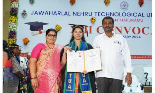 Amaravathi Jyothi - Andhra Pradesh / SPSNellore : కందుకూరు ఖ్యాతిని నిలబెట్టిన మృదుల.. కందుకూరు, అమరావతి జ్యోతి: నందమూరి తారక రామారావు కళాక్షేత్రం అనంతపురం నందు జవహర్ లాల్ నెహ్రూ సాంకేతిక విశ్వవిద్యాలయం నిర్వహించిన 13వ స్నాతకోత్సవం లోకందుకూరుకు చెందిన యర్రా ముసలయ్య కుమార్తె మృదుల అపార ప్రతిభ కనపరిచి ఇన్ఫర్మేషన్ టెక్నాలజీ విభాగంలో శ్రీ వెంకటేశ్వర కాలేజీస్ ఆఫ్ ఇంజనీరింగ్ (తిరుపతి). (జె ఎన్ టి యు) అనంతపురం స్థాయిలో మొదటి ర్యాంక్ సాధించడంతో ఆమెకు ఆంధ్రప్రదేశ్ రాష్ట్ర గవర్నర్ మరియు విశ్వవిద్యాలయ కులపతి ఎస్ అబ్దుల్ నజీర్ చేతుల మీదగా గోల్డ్ మెడల్ మరియు ప్రశంసాపత్రం ,పట్టా అందుకున్నారు ఈ సందర్భంగా సామాన్య కుటుంబంలో జన్మించి అపార ప్రతిభ కనబరిచి కందుకూరు ప్రజలకు కొంత ఆదర్శప్రాయంగా నిలబడిన మృదులను కుటుంబ సభ్యులు మరియు విద్యావంతులు అభినందించారు